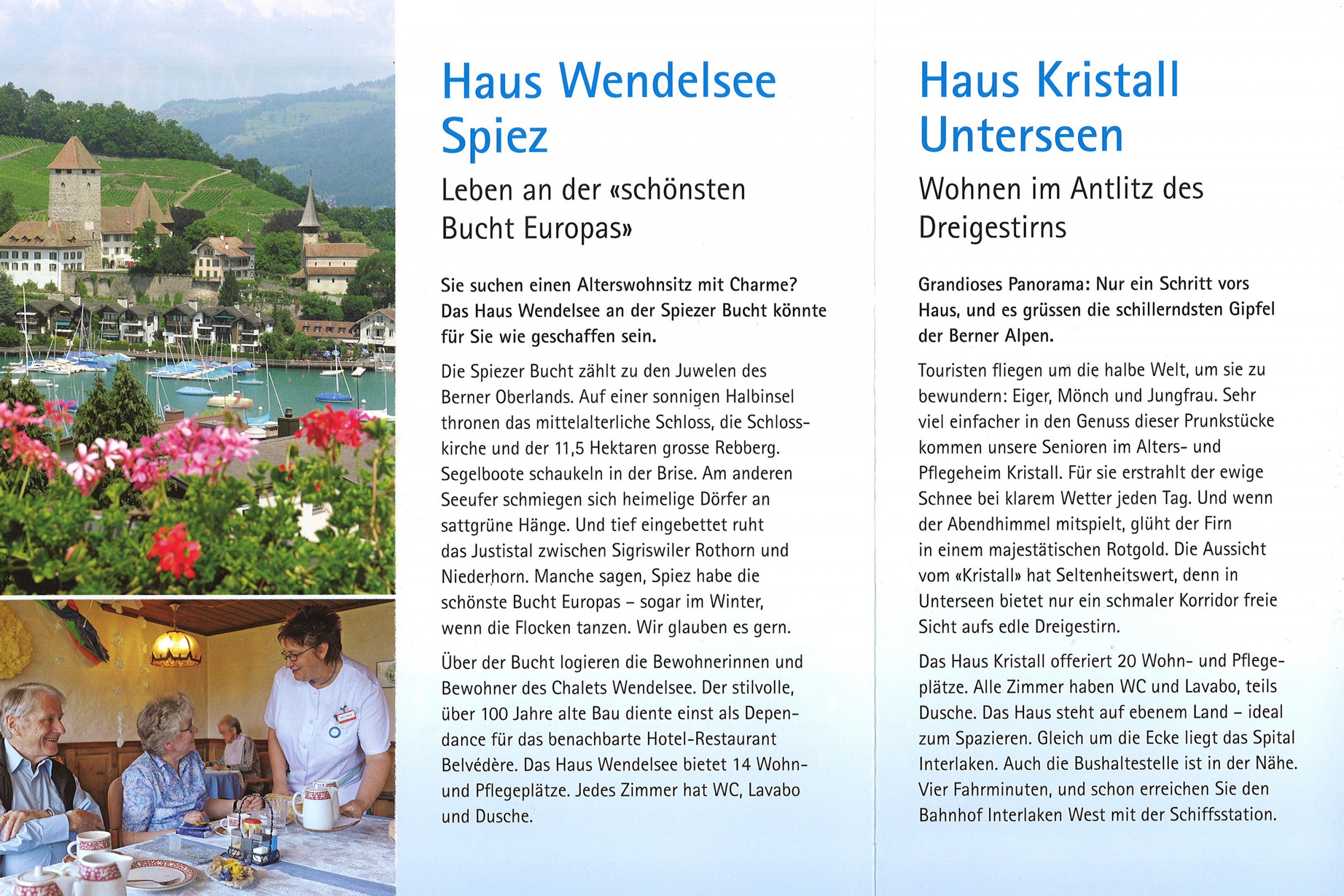 Die Leitung des Alters- und Pflegeheims Wendelsee in Spiez erwarb in Interlaken das Alters- und Pflegeheim Kristall. Der Zukauf machte einen Flyer nötig, der die beiden Häuser auf homogene Art vorstellen sollte. Zielpublikum sind Betagte, deren Angehörige und Ärzte.