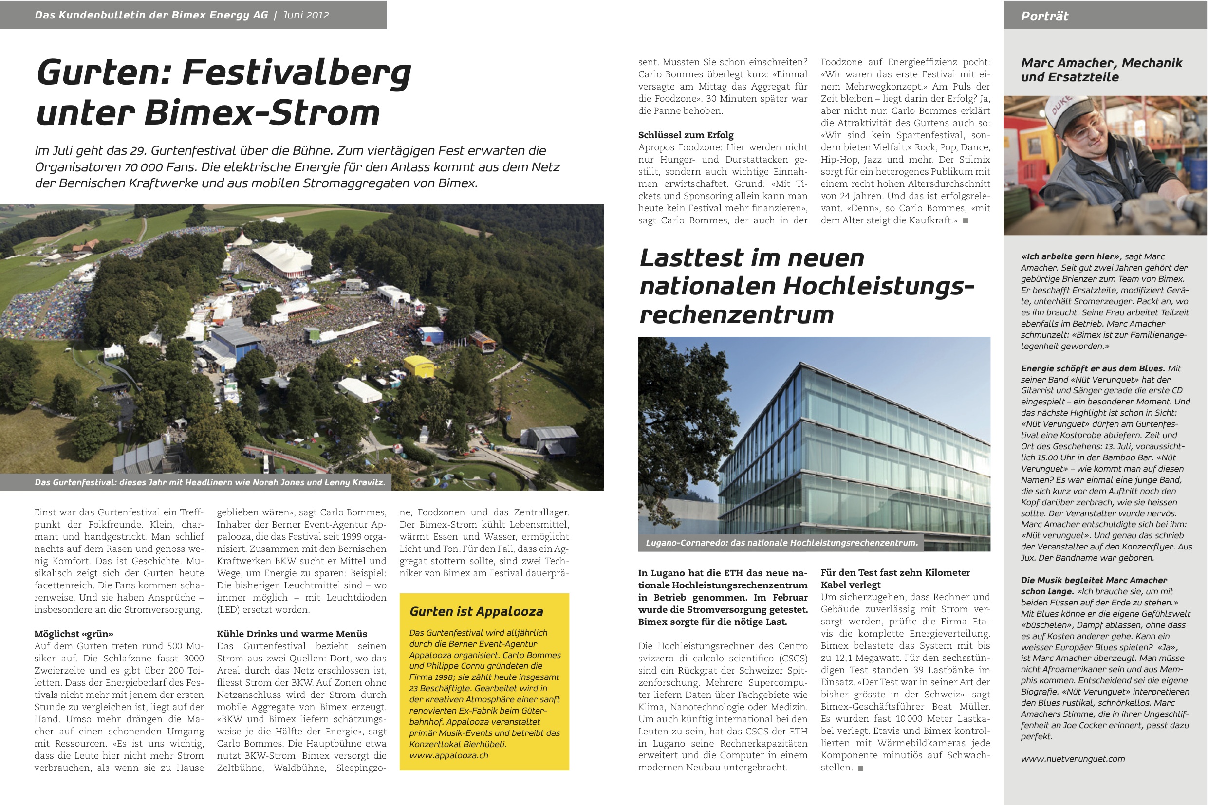 Die Bimex Energy AG mit Hauptsitz in Uetendorf entwickelt, baut und installiert hochwertige Notstromsysteme. Im Einsatz stehen über 2000 Anlagen. Zudem werden Stromaggregate und Zubehör vermietet. Bimex wünschte sich einen gedruckten Newsletter.